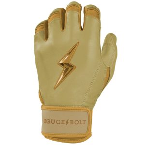 HIGHEST QUALITY. MOST DURABLE BATTING GLOVE IN BASEBALL: Each pair of BRUCE BOLT batting gloves are handmade by skilled craftsmen. Our GOLD Series gloves use 1.2mm Cabretta leather on the palm and the back of the glove which makes them buttery soft and more durable while providing better grip than any other glove on the market.