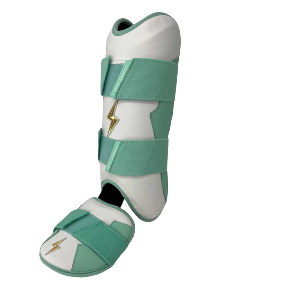 Designed by Eric with Bear. our Leg & Ankle Guards feature a semi-moldable thermoplastic protective shell with a Cabretta leather outer and Shark Skin inner to keep the guard in place both at the plate and while running the bases. 2 wide removable elastic strap locks the Leg Guard in place providing maximum protection at the plate.